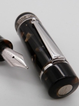 Made in 2009 as a limited edition pen for Chatterley pen - only 25 pens were made. This is a rare pre series pen - not numbered. The dark brown marbled celluloid shows tiny blu spots. It was used as well for the delta Sevivon pens.