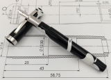 | Goldfink 49 pistonfiller, black ebonite wave pattern guillochee ** 14 K Goldfink gold nib, various nib sizes available - AND: choose between semi flex or regular nib. This new Goldfink model was made in collaboration with Leonardo pens based on a Goldfink design from the 1950ies in Berlin. This piston-filled pen is made on the lathe with an ebonite feed and cap bands fit in place by hand using traditional techniques.
