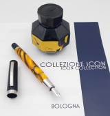 | Goldfink 49 pistonfiller, orange/black woodgrain pattern ebonite with rolled gold trim** 14 K Goldfink gold nib, EF tip with a variety of other nib options available as well.This new Goldfink model was made in collaboration with Leonardo pens based on a Goldfink design from the 1950ies in Berlin. This piston-filled pen is made on the lathe with an ebonite feed and cap bands fit in place by hand using traditional techniques.