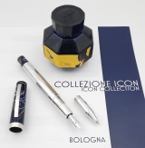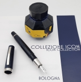 | Goldfink 49 pistonfiller, blue ebonite barrel and black ebonite** 14 K Goldfink gold nib, Broad tip with a variety of other nib options available as well.This new Goldfink model was made in collaboration with Leonardo pens based on a Goldfink design from the 1950ies in Berlin. This piston-filled pen is made on the lathe with an ebonite feed and cap bands fit in place by hand using traditional techniques.