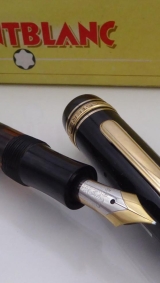 | Montblanc no. 144 Masterpiece, pistonfiller, celluloid, perfect inkwindow ** 14 K twotone, extra fine tip, flexible[Kein deutscher Text vorhanden] A wonderful Masterpiece pen, fully working with a 14 K fine to medium tip nib. Pen is made from Celluloid and uses the famous full metal telekopic piston mechanism. The trims show no brassing, the barrel is deep black with no signs of ambering. Pen has the early flat feed, showing, that the pen is made in . . . |