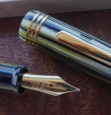 | Tibaldi Iride vaccumfiller, brown marble and transparent celluloid 18K nib, fine tip Questa è una delle famose penne in edizione limitata Tibaldi in celluloide prodotta nel 1998. Questa penna restaurata è tornata completamente funzionante - il sistema di caricamento di questo modello spesso deve essere sostituito e, questo, ne ha uno nuovo in acciaio ed ebanite. Le guarnizioni O-ring in gomma, che spesso si induriscono velocemente, sono state sostituite da una . . . |