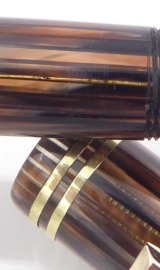 | Montblanc Prototype 244 tortoise striped delluloid 14 K original gold nib, KM - Ballpointed Medium tip[Nessun testo in lingua Italiana disponibile] This is a very interesting pen, sold some years ago by a retired montblanc worker. Model is a 244, but it is made from a different celluloid, a light brown tortoise colour alternating with transparent lines. Wonderfully kept, fully working prototype with a great KM gold nib. |